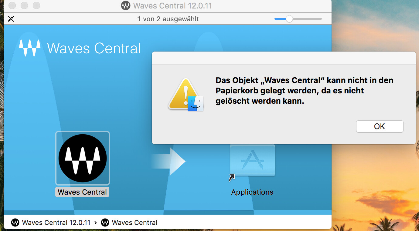 So I pressed “move to applications folder” but then there opened another pop-up (“waves central could not be put in the trash folder because it cannot be delated”).